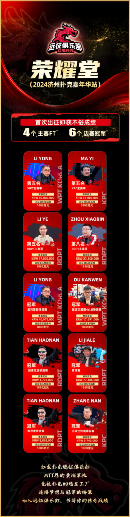 在2024济州扑克嘉年华中,首次出征的红龙远征俱乐部的成员们以卓越的竞技实力创造辉煌战绩: